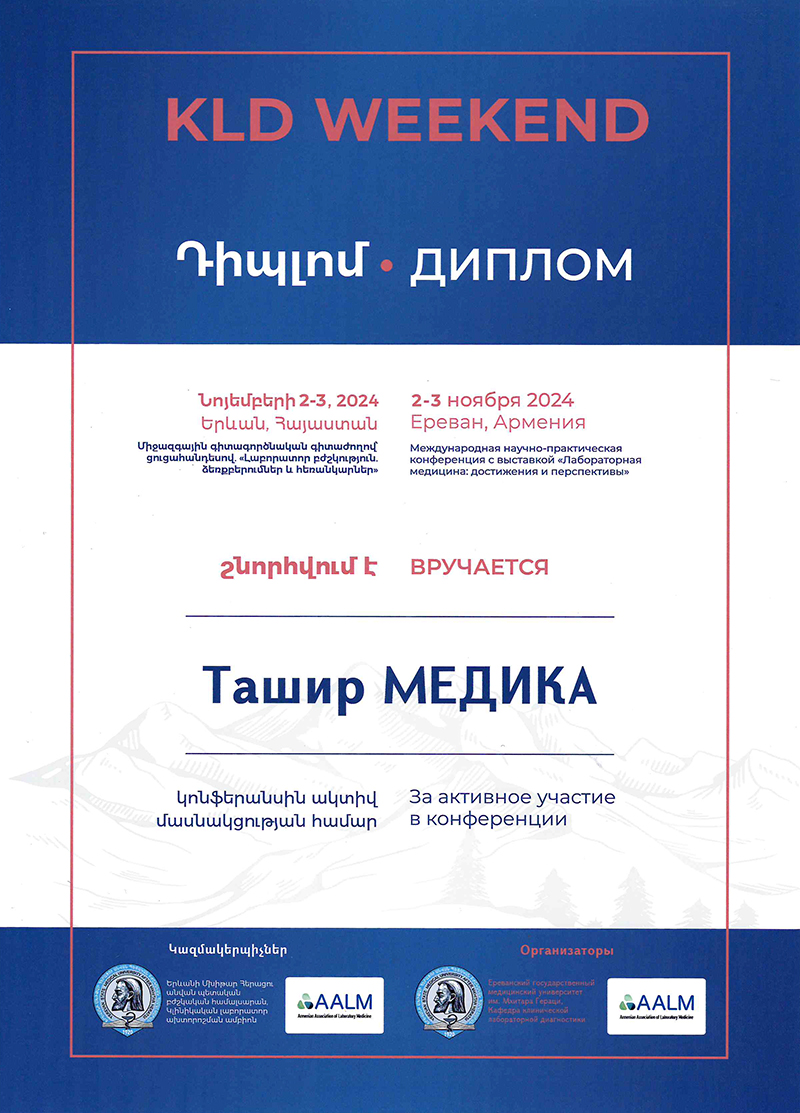 ГК «Ташир МЕДИКА» выступила стратегическим партнером международной научно-практической конференции с выставкой «Лабораторная медицина: достижения и перспективы» (KLD WEEKEND), которая проходила 2-3 ноября в г. Ереване.
